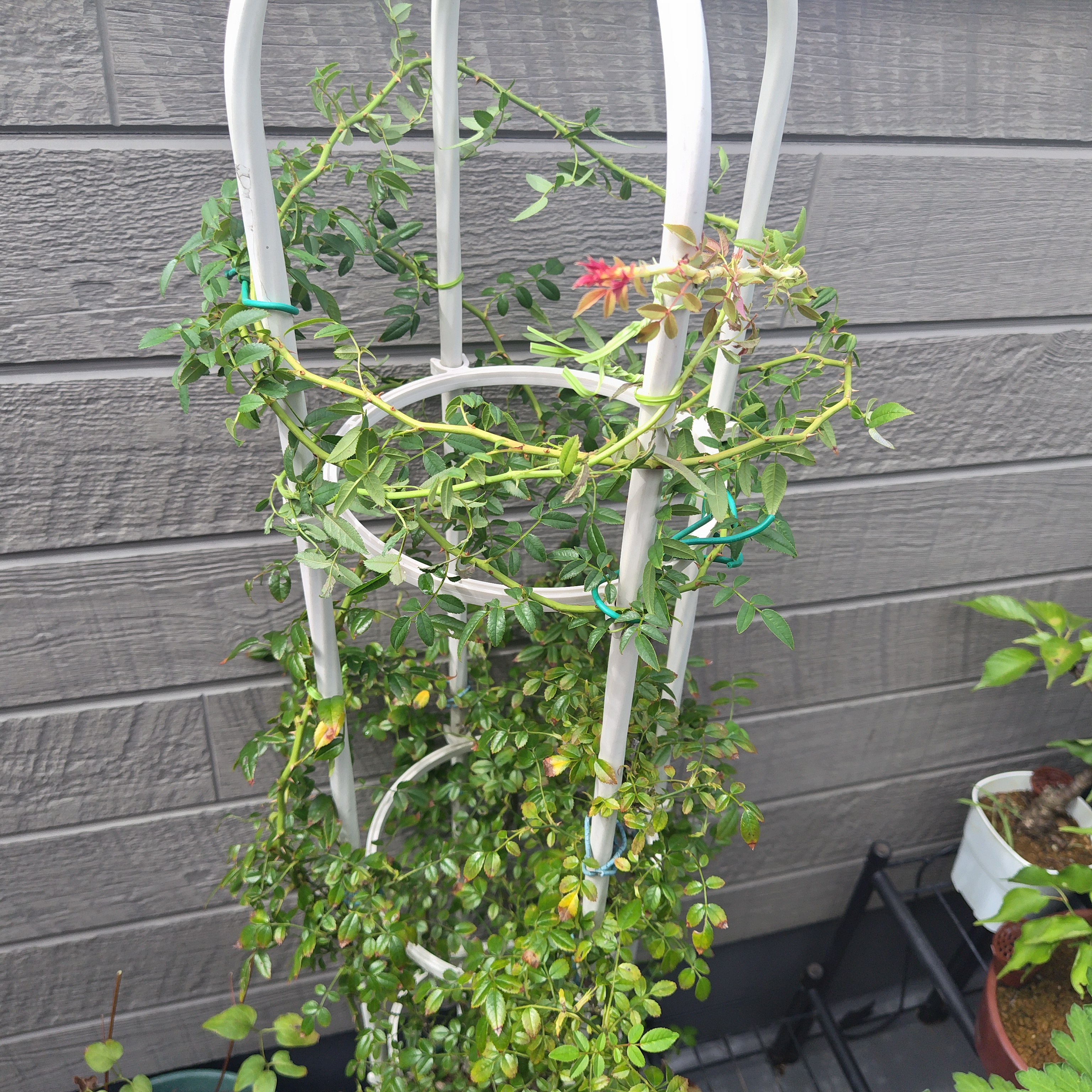 ミニバラの新枝(シュート)を誘引