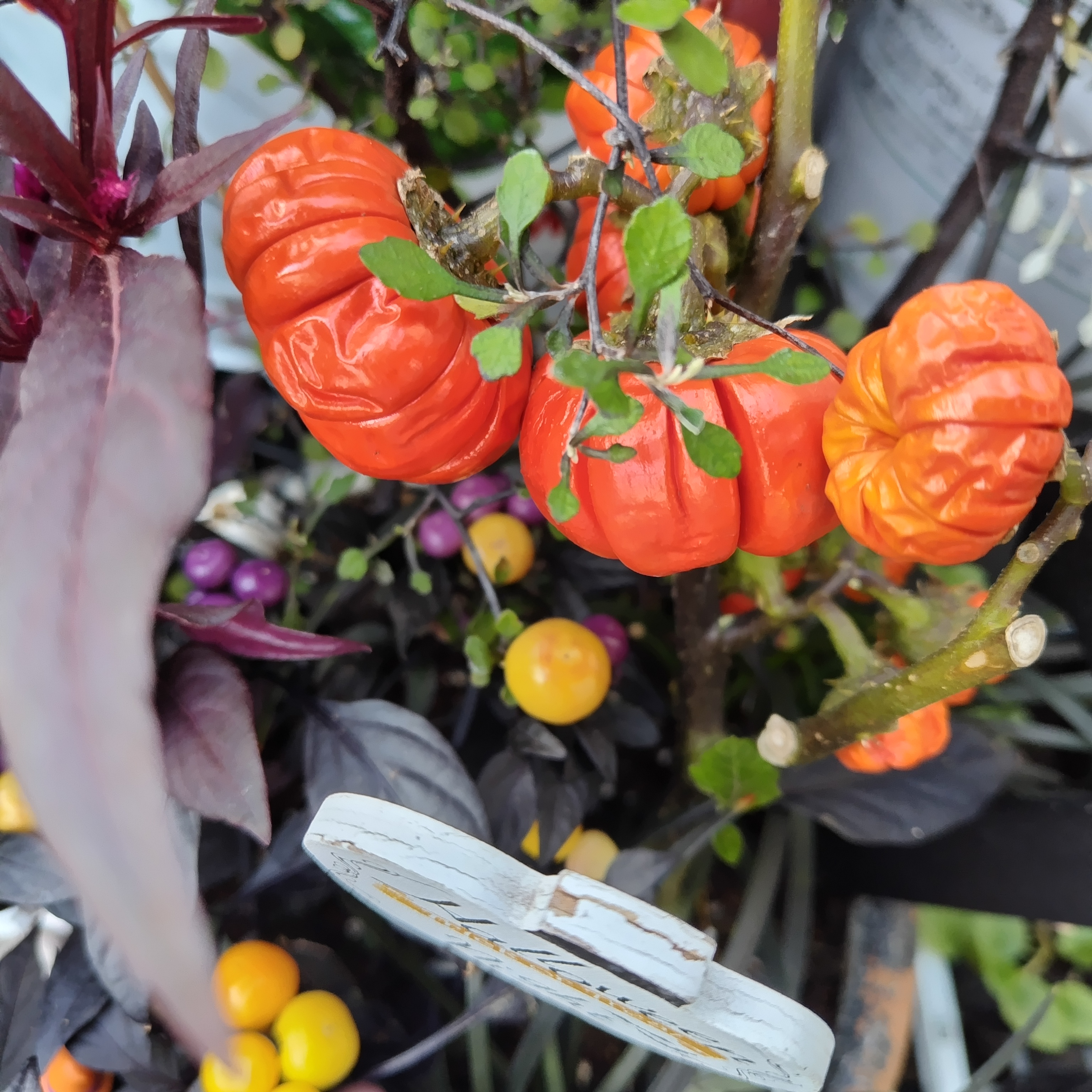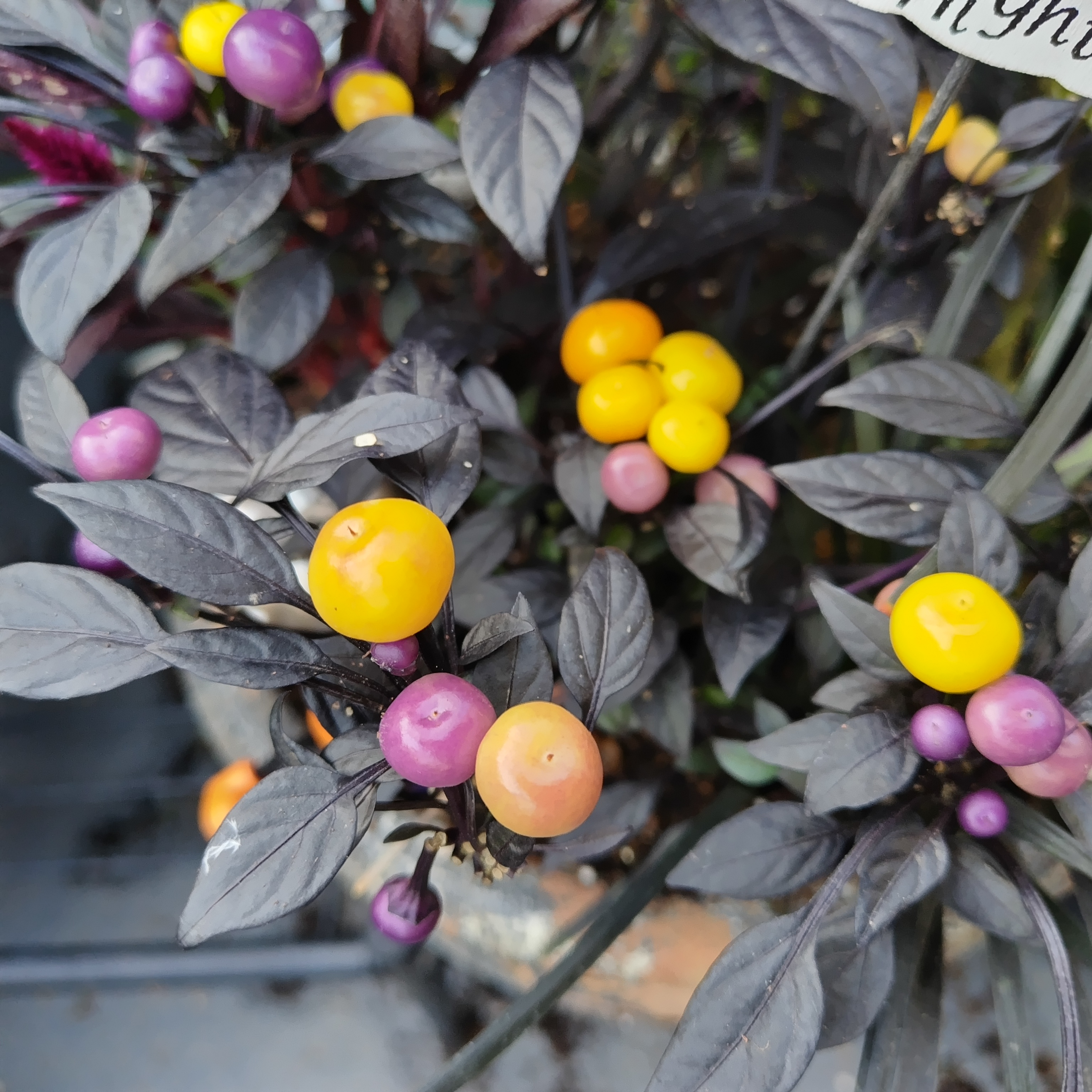 黒葉で、実の色が紫→黄色→オレンジへと変わっていくという