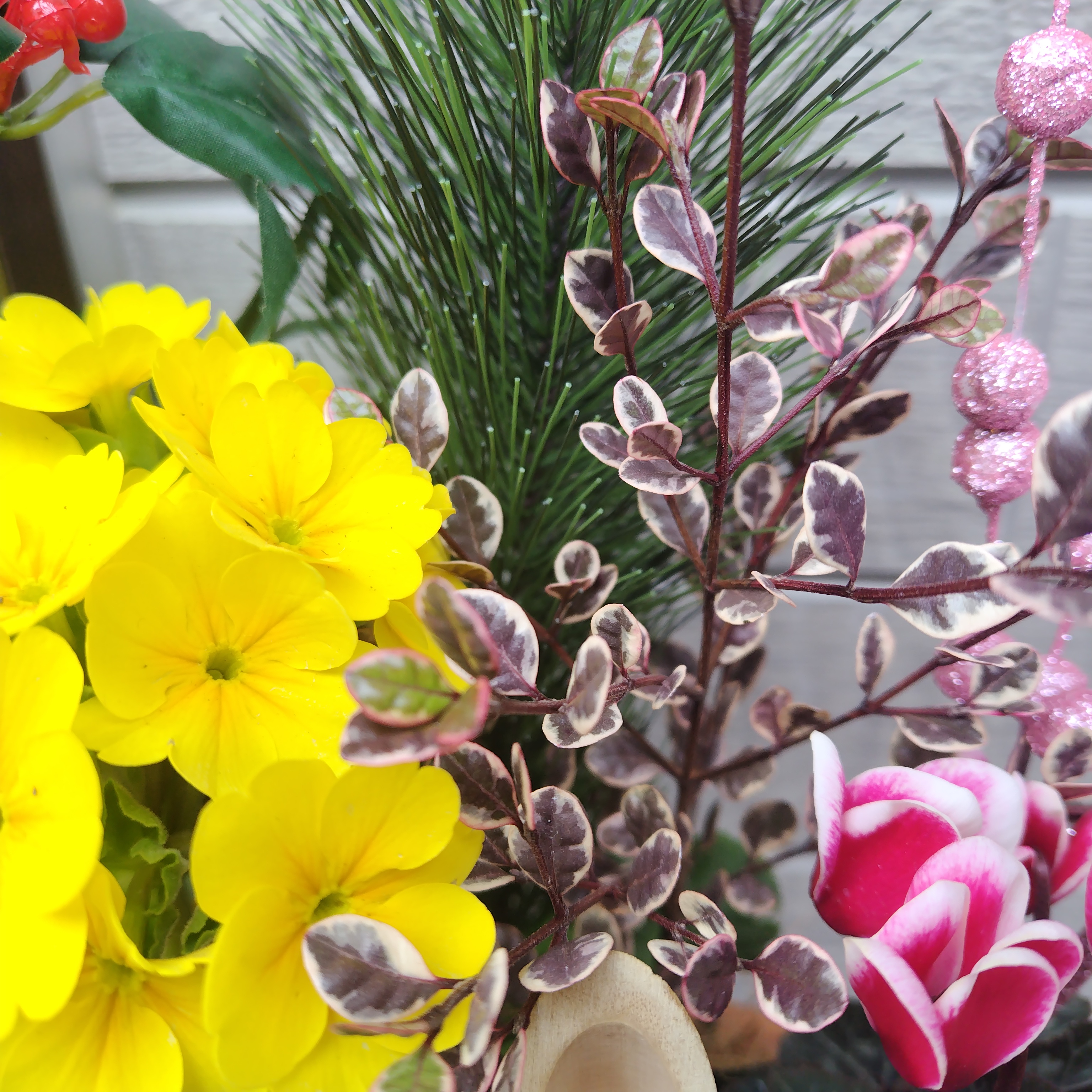 ガーデンプリムラ(黄色)、ガーデンシクラメン(赤×白)、キラキラハボタン、ヘデラ(ゴールデン)です。