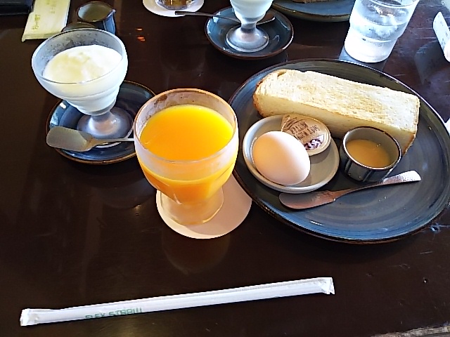 トースト、半熟卵、ジュース、ヨーグルト、これで550円