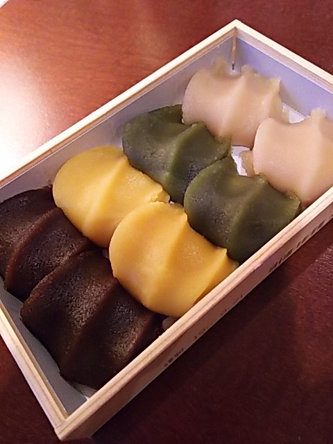 白あん、オオバコ若葉、とうもろこし、黒糖の4色です。
