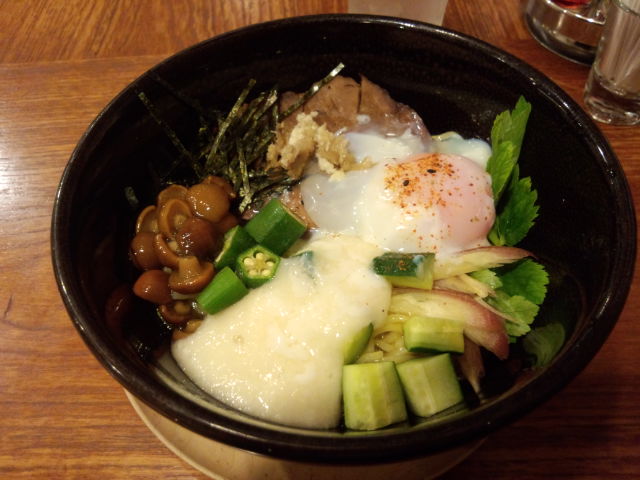 空海の冷やしぶっかけラーメン。 とろろ、なめこ、オクラが入ってて トロネバ。 結構にんにくがきいてて、おいしいんだなあ。 完全にはまったよ。