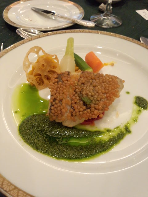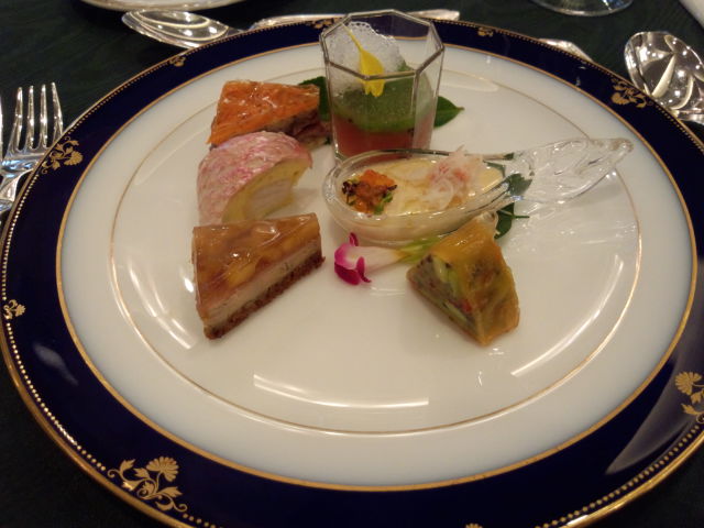 フォアグラと生ハムのミルフィーユ、ラムロースの味噌風味、白身魚のテリーヌ