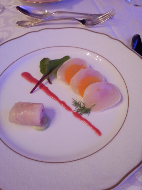 帆立貝のラビオリ仕立て ズワイガニを巻いた鯛のファルシー
