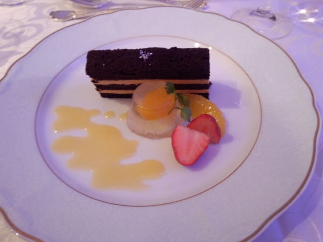 潮キャラメルのガトーショコラ スパークリングワインのジュレとオレンジソース