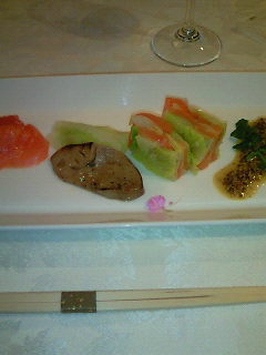 フォアグラとスモークサーモン、春キャベツ。