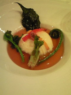 桜鯛とタラバガニを豆乳で蒸したものです。