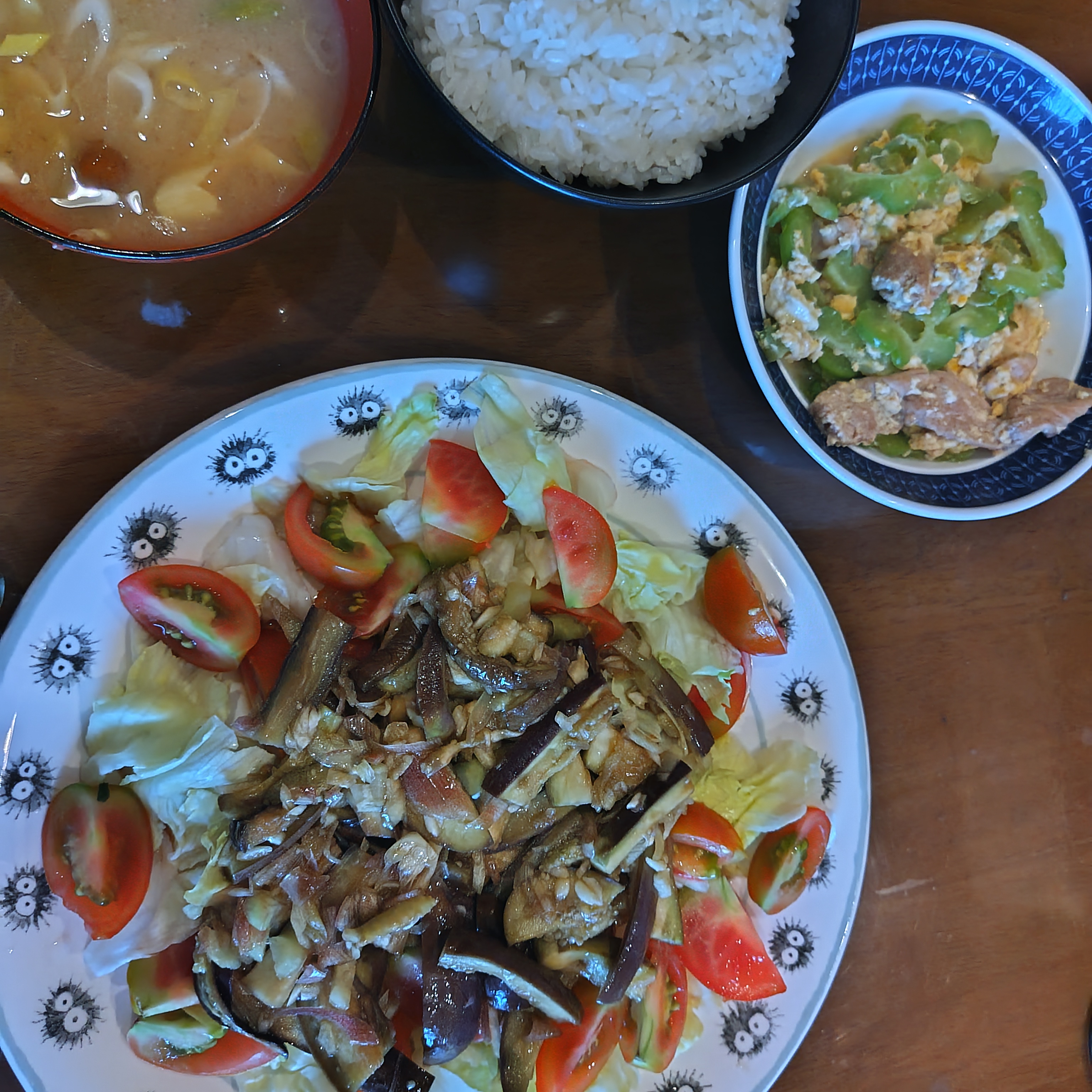 畑で取れたてのゴーヤとトマトと茄子をいただいたので