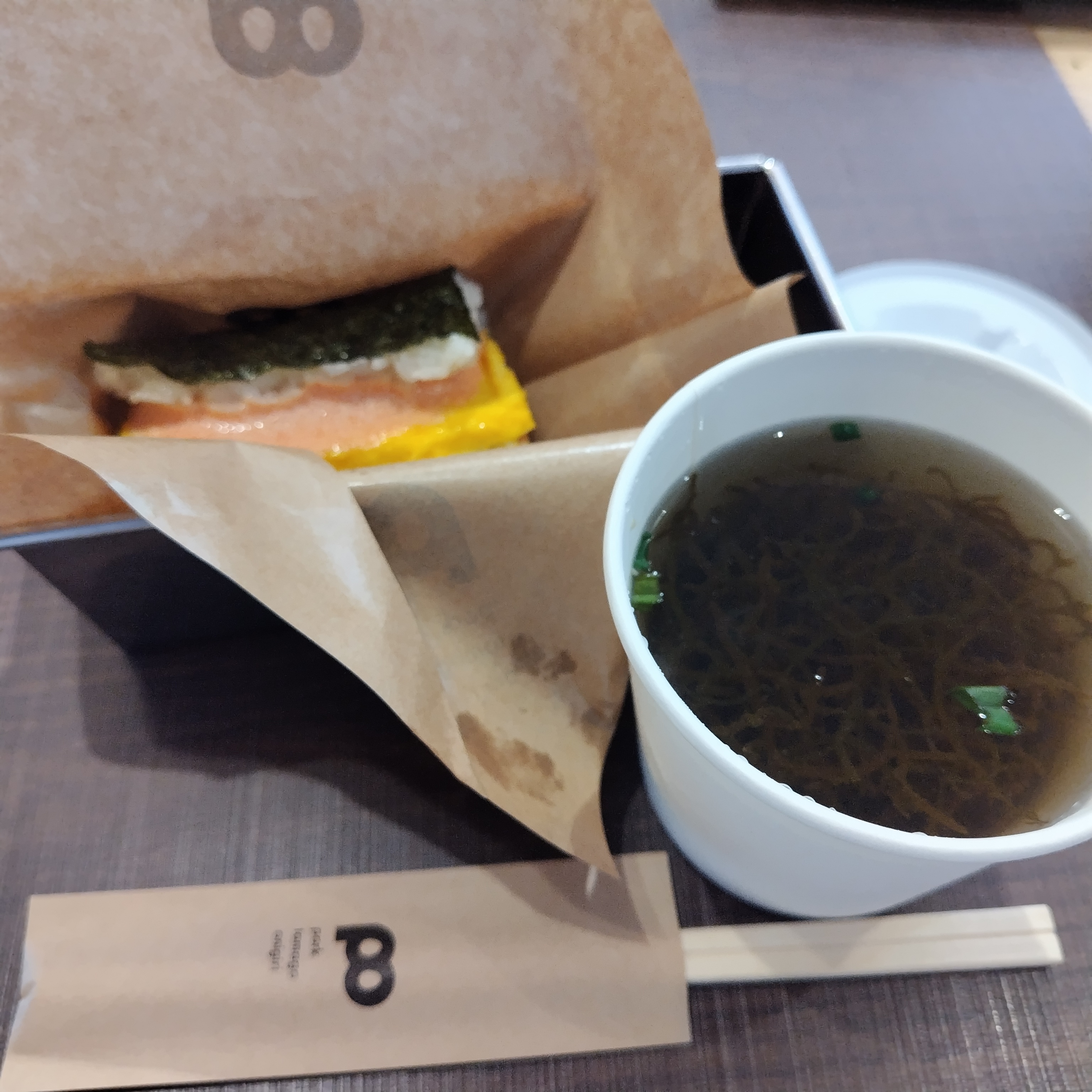 お昼は那覇空港でポークたまごおにぎりとモズクスープを食べました。