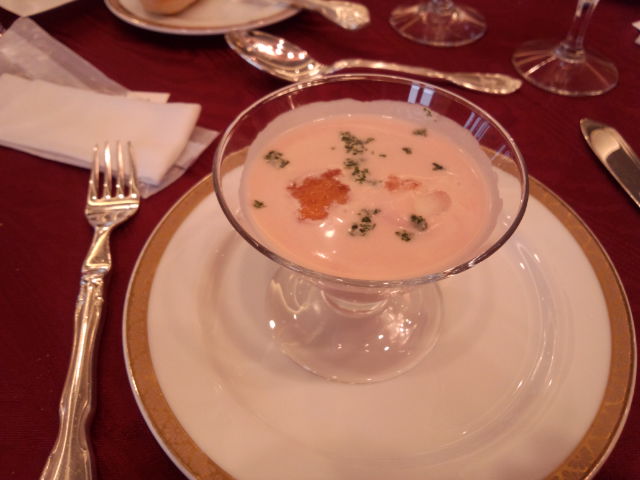 紅芯大根のクリームスープにトマトのジュレとレモンソルベを浮かべて