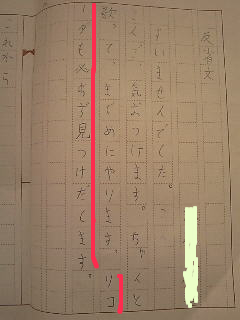 5年のH君がもう2月だっていうのに 冬休み明けから1回もリコーダーを持ってこない上、 ふざけて歌もまともに歌ってないので ついに怒り爆発。 反省文を書かせた。 「リコーダーは必ずみつけだします」って。 オマエは勇者か。 オマエんちはダンジョンか!