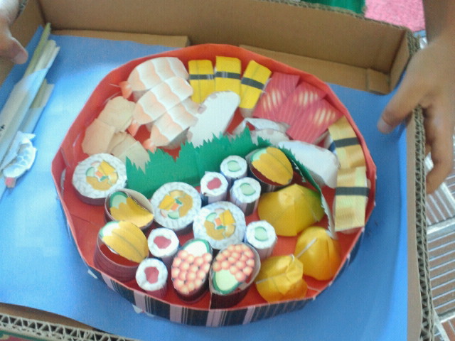 中学、高校でいう文化祭みたいなものかな。 各学級で、お店屋さんを出して みんなで回る、っていうもの。 今年は「作って遊ぼう」がテーマで 手作りおもちゃを作って みんな楽しく遊んでました。 5-1は、レストラン。  気のすむまで作れます、ってw 宣伝係の子が見本の品を見せてくれました。  見事な寿司w 他にもオムライスとかデザートとか作って みんな楽しそうでしたw
