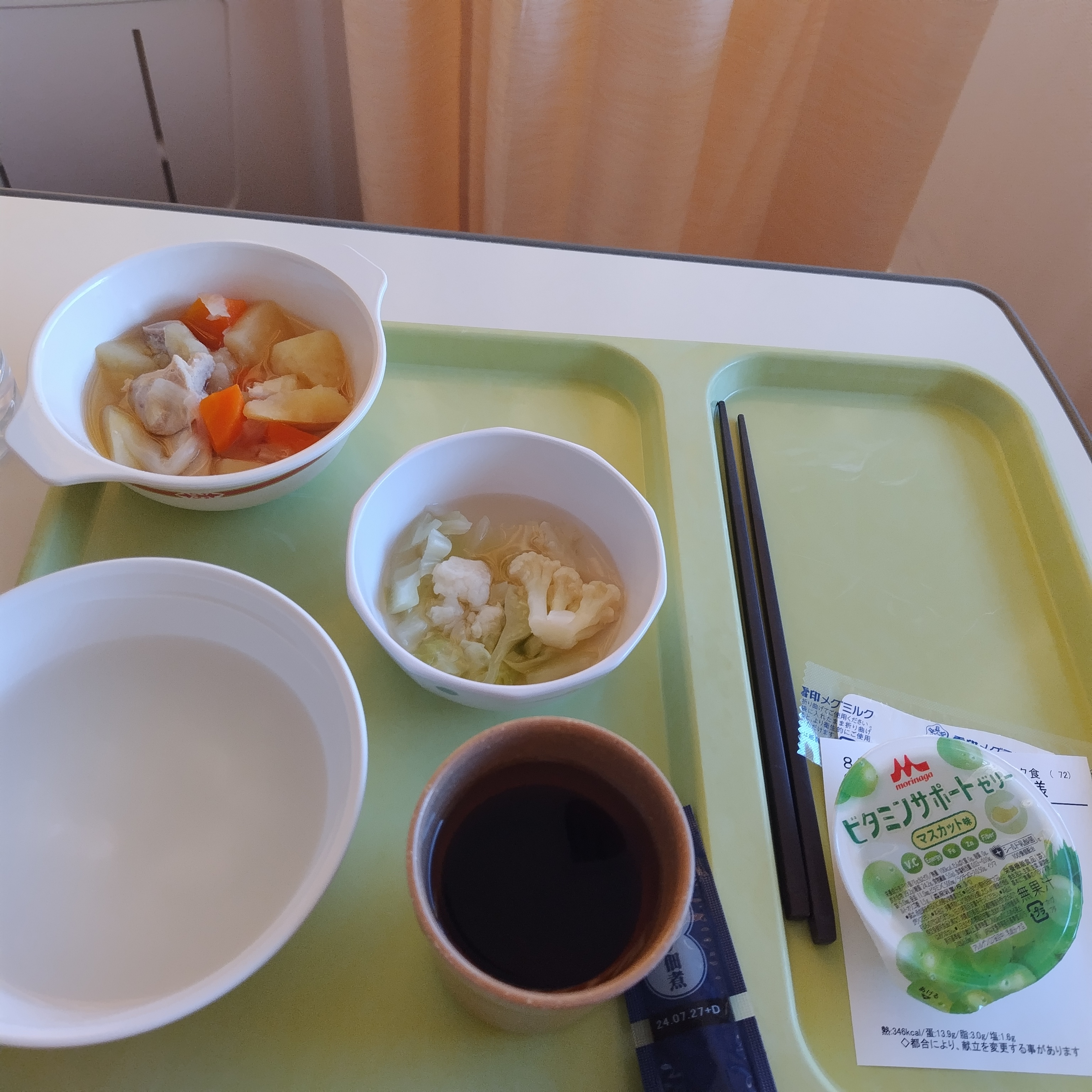 こんな食事だけど、全然食欲ないよ 吐いちゃいそうで食べられない。 ダイエットだと思うしかないね。 そんな中だけど家族がお見舞いに来てくれて 息子夫婦が可愛いお花をくれた。 しょぼくてごめんとか言っていたけど、 病院で手軽に飾れるサイズにしてくれたんだろうね。 嬉しかった。 早く元気にならなくては。