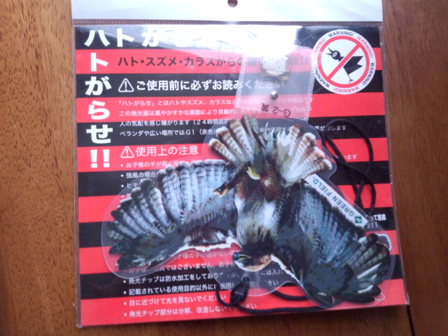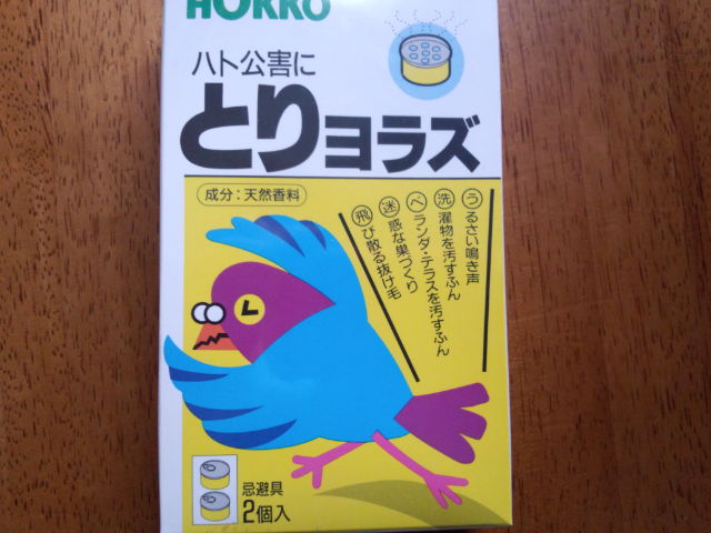 本日2点買ってきました! まずはハトがらせ!とかいう商品。 タカみたいな鳥の絵の下に ピカピカ発光するものがついてます。 これを物干しのところにぶらさげてみた。  あともうひとつ、 とりヨラズという商品。 こっちはにおいでハトをよせつけないタイプ。 人には無害って書いてあって まあ柑橘系みたいなにおいなんだけど 長くかいでるとやっぱり気持ち悪くなってきます。 これで来なければいいんだけどね。