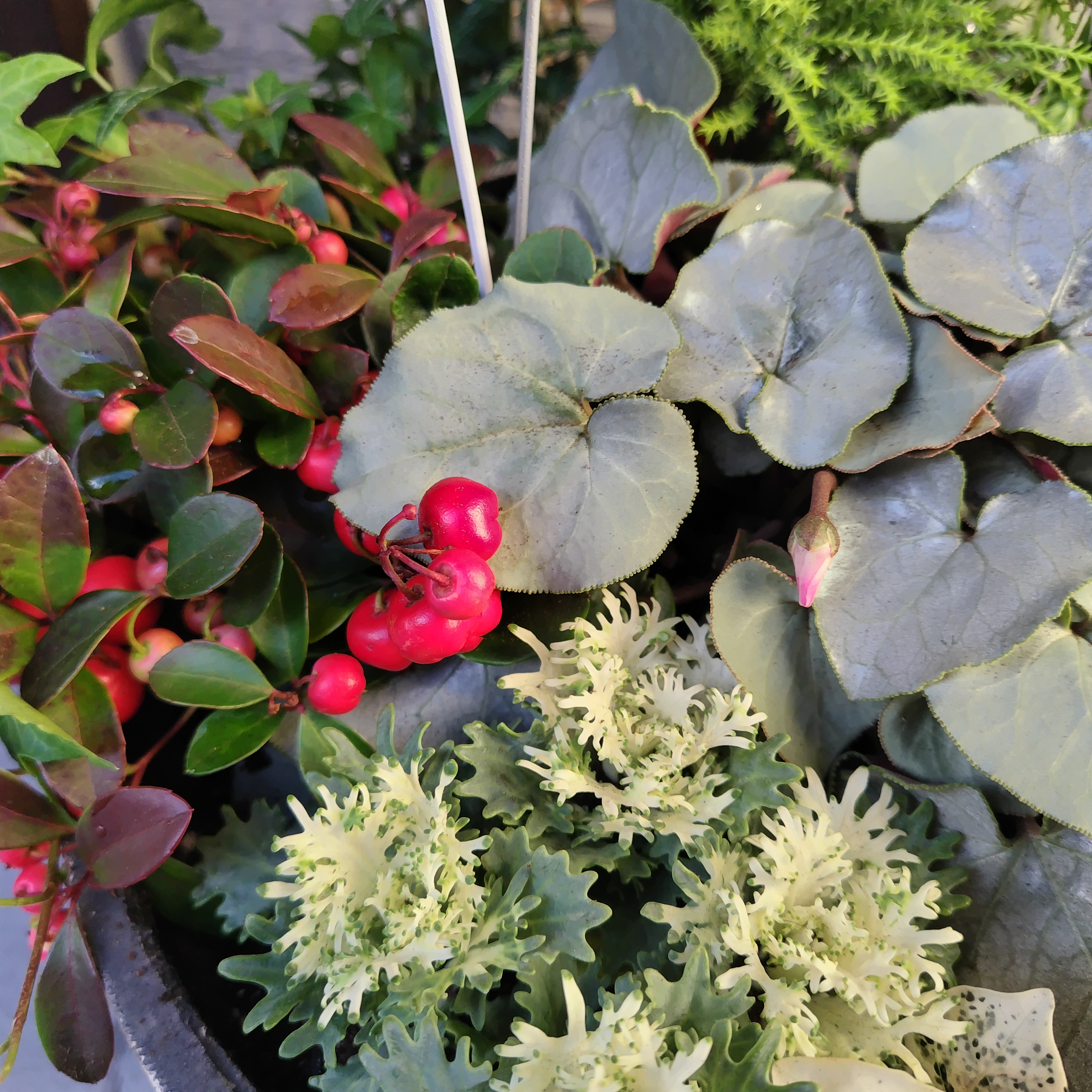 使ったのは、ゴールドクレスト、シクラメンアフロディーテ、チェッカーベリー、パンジー2種、初雪カズラ、ヘデラ、ハボタンです。