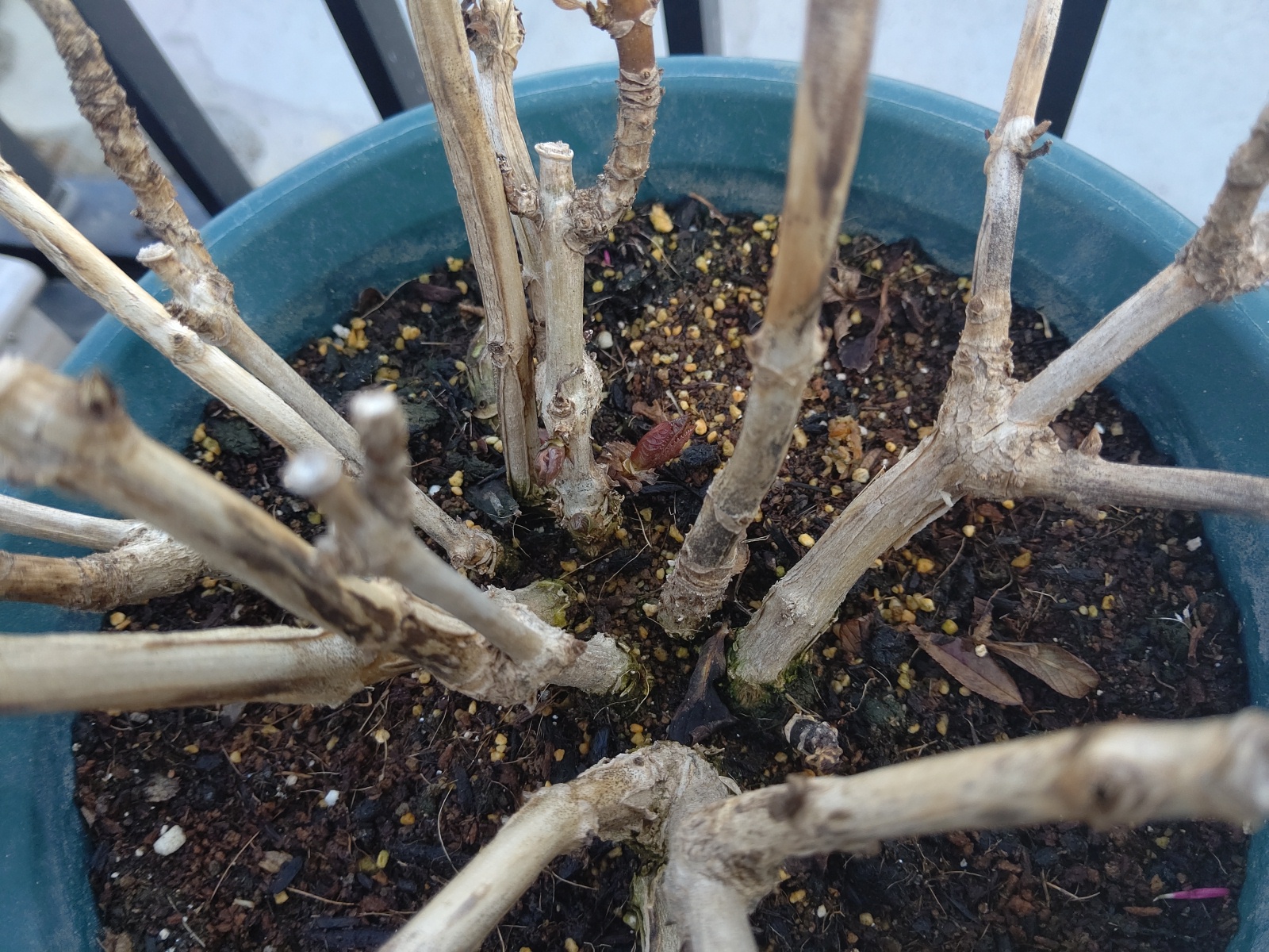 葉っぱが完全に枯れきってないけど花芽出てくるのかなあ。