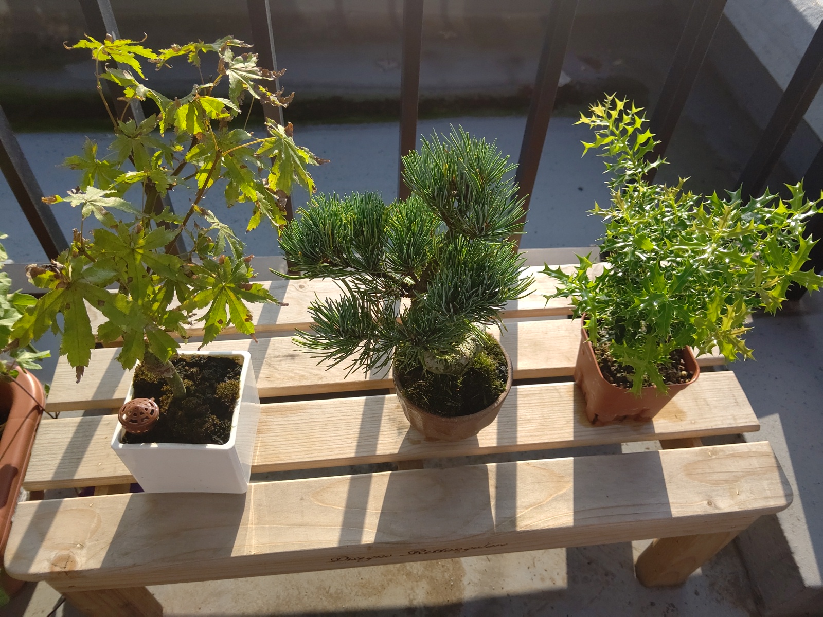 ミニ盆栽、紅葉(左)と五葉松(中)と姫ヒイラギです。