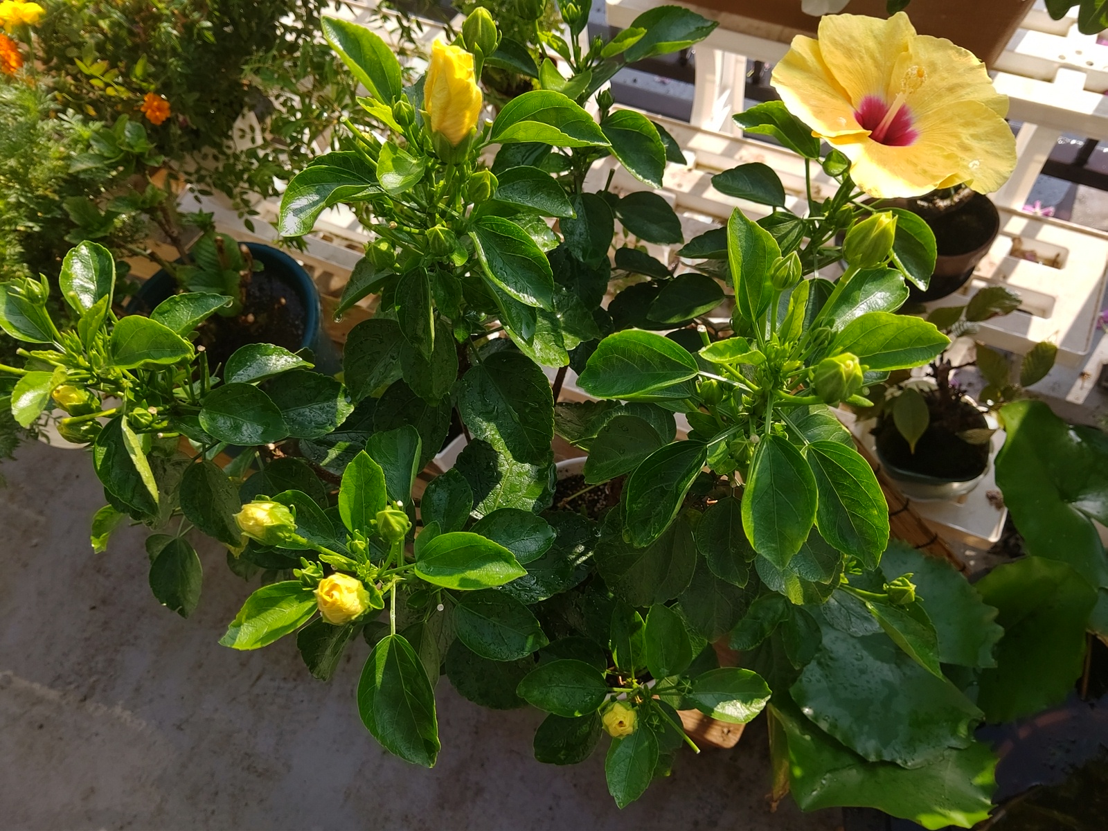 最近は、暑さに強いニチニチソウとハイビスカスとマリーゴールドの影に
