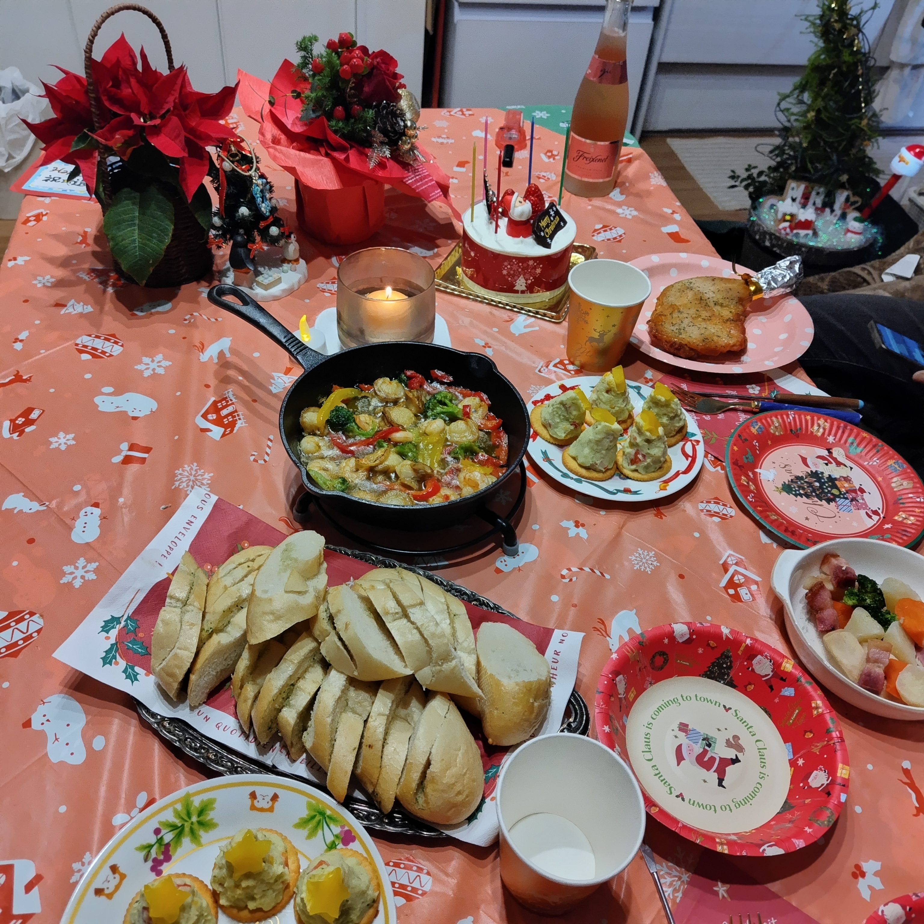 ローストチキンレッグ、チーズフォンデュ、アヒージョ、ポテトサラダ