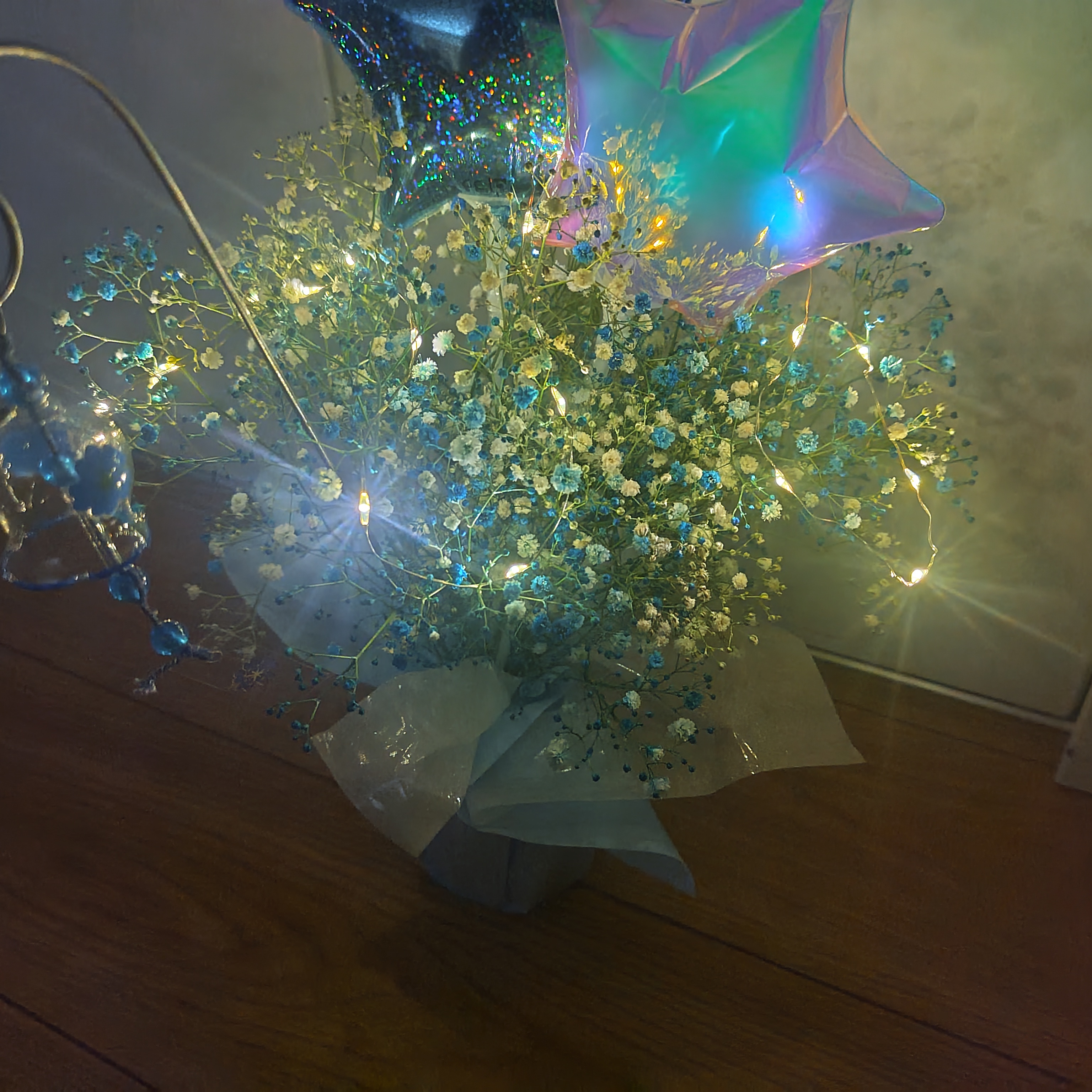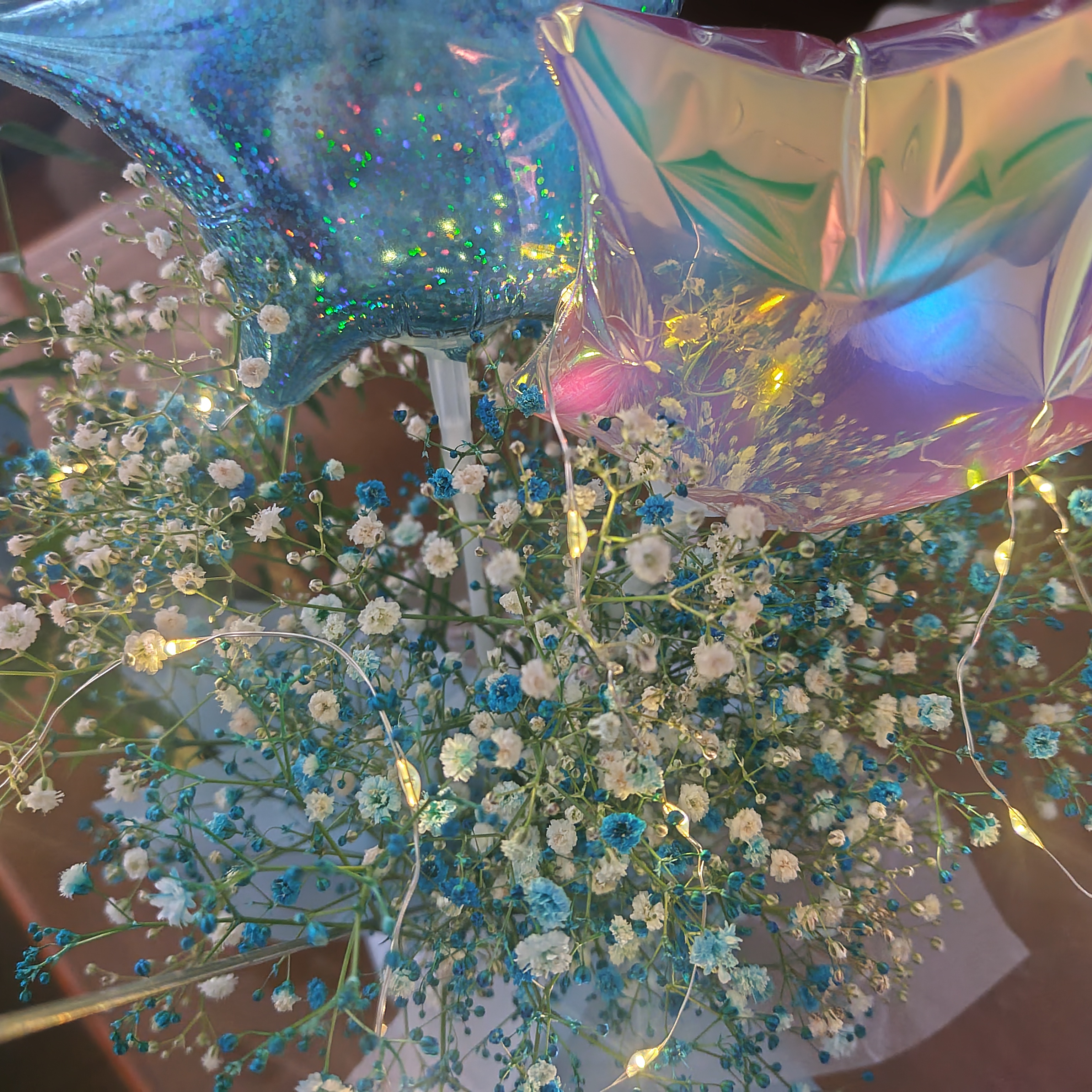 夏らしく爽やかにブルーの染めのカスミソウ。